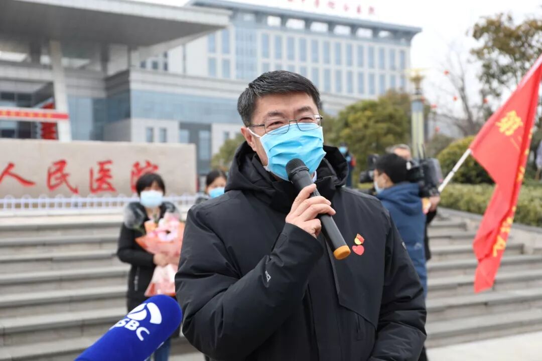 李小民作为连云港市第三批援鄂医疗队总指挥发言:“此次援助任务是党中央作出的重要决策,医疗队一定不忘初心、牢记使命,发扬新时代卫生人职业精神,越是艰险越向前的精神,圆满完成任务”。