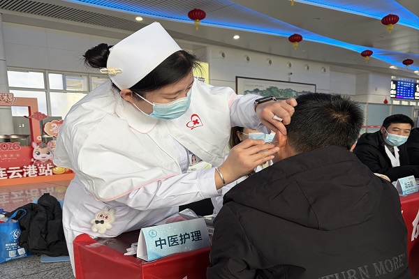 中医护理体验区也备受青睐。市一院中医小组的护士凭借精湛的技艺,运用耳穴贴压这一中医特色疗法,为旅客们精准“把脉”解决健康问题。旅客王先生体验后表示:“长途奔波头晕乏力,贴压几分钟精神多了。这种‘小穴位解决大问题’的中医特色疗法,既方便快捷又安全有效,让我在旅途中感受到了中医药文化的独特魅力。”