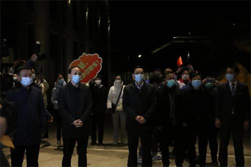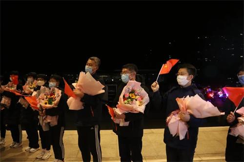 晚上气温骤降,寒风凛冽,高速路口、大道两旁、酒店门口站满了翘首企盼的人群,大家手持条幅,挥舞国旗,共同等候援鄂英雄们归来。