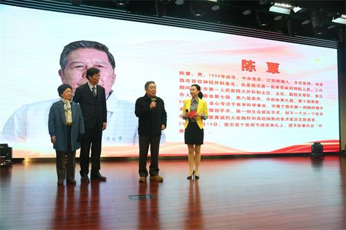 王富元及颜士卫主任为陈覃及其夫人、我院妇产科老主任张子云献花。陈覃院长感动地说:“我羡慕在座的医务工作者,你们生活在一个好的时代,拥有好的医疗设备条件,希望大家能不忘初心,牢记使命,牢记医学誓言,努力在医德和技术方面并进,造福百姓。”