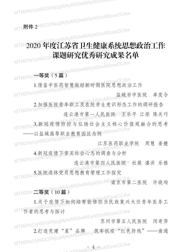 近日,在江苏省卫生思想政治工作促进会的评选表彰中,我院王乐平、江荣、陈关巧共同撰写的课题 “加强医院青年职工及在院学生意识形态工作的调研报告”荣获江苏省卫健系统思政课题研究优秀研究成果一等奖。