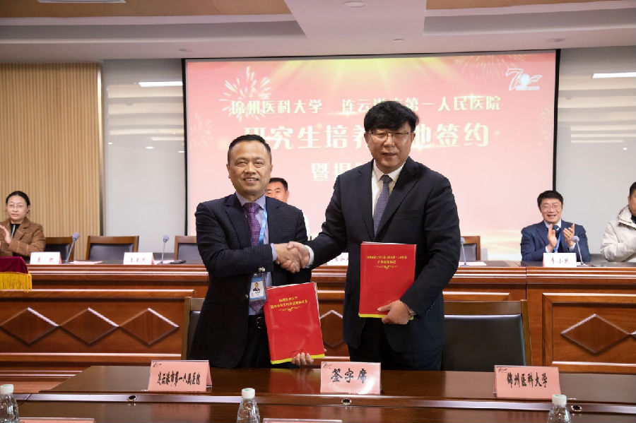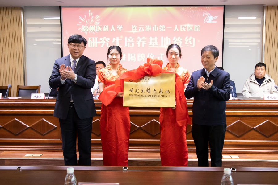 丁维光校长和李爱民院长共同签署了《锦州医科大学与连云港市第一人民医院合作框架协议》、《锦州医科大学校外研究生培养基地协议书》,王加培主席和丁维光校长共同为“锦州医科大学研究生培养基地”揭牌。揭牌仪式后,丁维光校长作《生产力理论视角下的医院管理与经营》专题讲座。