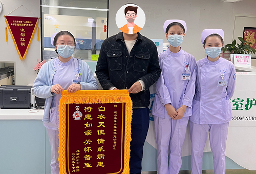 近日,患者纪女士的丈夫专程将一面写有“白衣天使情系病患 待患如亲关怀备至”的锦旗送至我院通灌院区急诊输液室,感谢护士们在纪女士发热输液期间给予的无微不至的关怀。